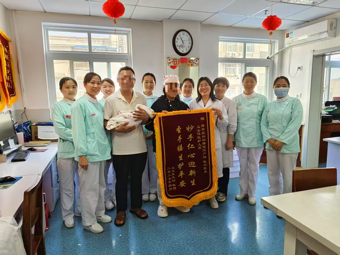 据悉,该产妇系第六次妊娠,伴有妊娠期高血压及臀位足先露双重高危因素。孕期,产科团队为其制定个性化管理方案,通过精准药物调控与饮食指导,将血压稳定在安全范围。足月后,经多学科联合会诊,量身定制剖宫产手术方案。术中,医疗团队凭借丰富经验与精湛技术,顺利娩出健康新生儿;术后,护理团队提供精细化照护,母子俩于5天后平安出院。家属特赠送 “妙手仁心迎新生,圣手接生护平安” 锦旗,感谢科室全程保驾护航。