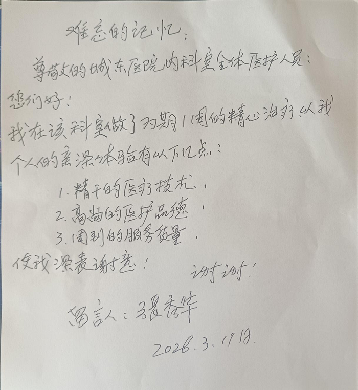 这封手写感谢信,不仅是对内科团队工作的肯定,更是对我院“以患者为中心”服务理念的生动印证。内科全体医护人员表示,这封信既是荣誉,也是鞭策,他们将继续以精湛的医术和温暖的初心,守护每一位患者的生命与健康。