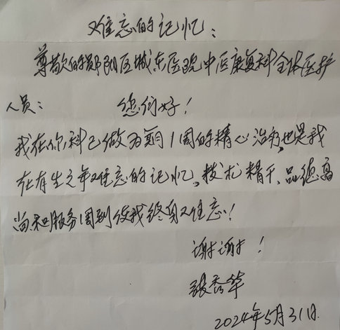 在感谢信中,张大爷表示:“在这里已做为期一周的精心治疗,是我在有生之年难忘的记忆。”中医康复科一直以来致力于为患者提供优质的医疗服务,精心制定个性化的治疗方案,以帮助患者尽快康复。通过张大爷的感谢信,也让康复科的医护人员收获了满满的幸福和成就感。
